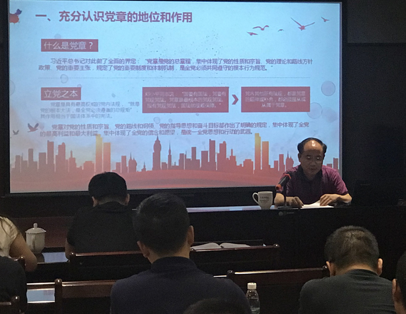 黨總支書記、總裁劉健同志在《學(xué)習(xí)尊崇黨章,爭(zhēng)做合格黨員》的黨課中,從黨章的地位、作用、歷程等方面向黨員全面解讀了中國(guó)共產(chǎn)黨章程,從黨章規(guī)定的黨員義務(wù)、習(xí)總書記系列重要論述及“四講四有”等角度闡述了合格黨員的標(biāo)準(zhǔn)。他希望公司黨員自覺(jué)以黨章、習(xí)總書記講話精神和“四講四有”為標(biāo)尺,隨時(shí)糾正個(gè)人的思想和行為,保持思想品德的純潔,保持工作作風(fēng)的優(yōu)良,保持工作績(jī)效的先進(jìn),保持個(gè)人行為的廉潔,主動(dòng)融入公司的發(fā)展大計(jì),盡職盡責(zé)做好本職工作。